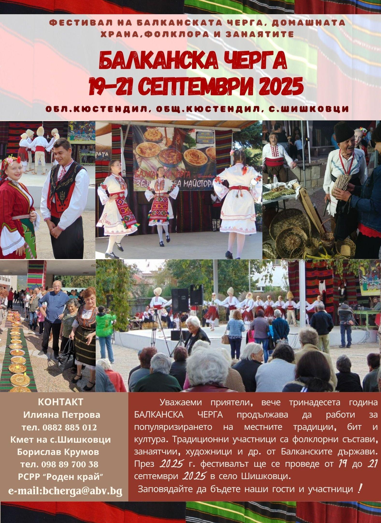 Балканска черга е колоритно събитие, на което всеки може да чуе, да види, да опита. Предлагат се различни вкусове, традиционни ястия, напитки. Всеки може и да участва в различните състезания.